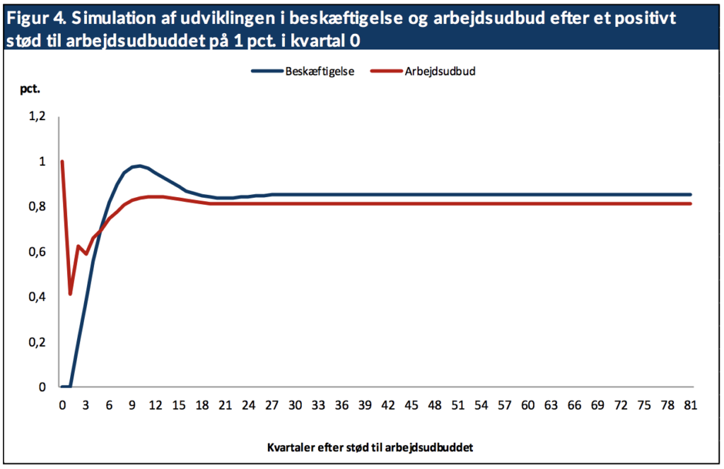 Det ses, at beskæftigelsen er i sin nye ligevægt (hvor kurven er flad) 18-24 kvartaler efter stigningen i arbejdsudbuddet. Altså er beskæftigelsen i ligevægt ca. 4-6 år efter, at arbejdsudbuddet steg til at starte med. Dette er en smule langsommere end hvad, der regnes med i Finansministeriet, hvor økonomien antages at være i ligevægt efter 4-5 år. I ADAM-modellen er tilpasningshastigheden lavere end den fundne og tager ca. 20 år.