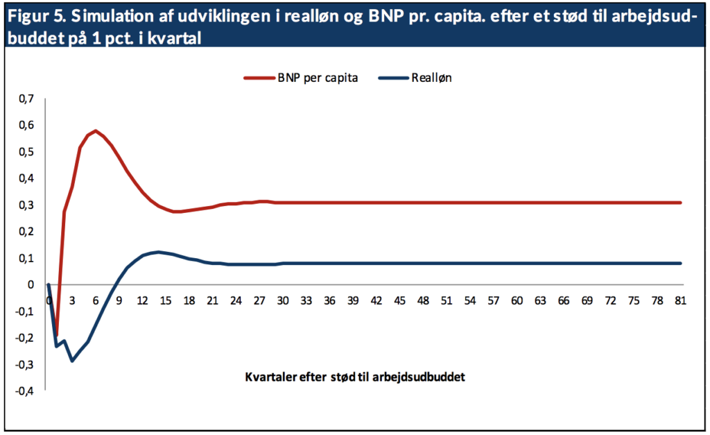 Det bemærkes desuden, at BNP per capita først ser ud til at være i ligevægt ca. 23 kvartaler efter stødet til arbejdsudbud. BNP per capita er således i ligevægt 5-6 år efter stødet til arbejdsudbuddet. Herved er BNP per capita en smule langsommere til at tilpasse sig den nye ligevægt end beskæftigelsen. Dette skyldes formodentligt, at kapitalapparatet er forholdsvist langsomt til at tilpasse sig. Lignende betragtninger gælder for reallønnen.
