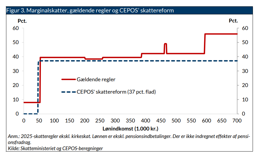 Reformen indfører en 37 pct. flad skat på lønindkomst, bl.a. ved at fjerne arbejdsmarkedsbidrag og topskat. Samtidig sænkes selskabsskatten til 12 pct., mens der indføres en flad skat på 25 pct. på ak-tie- og renteindkomst. Desuden fjernes modregning i børnecheck samt modregning i folkepension og førtidspension for arbejdsindkomst, hvilket medfører lavere sammensat marginalskat. Derud-over afskaffes en række afgifter, herunder registreringsafgift, tinglysningsafgift, afgifter på is, kaffe og chokolade samt arbejdsskadeafgift. Afgifterne på fx el, cigaretter og spiritus reduceres. Desuden udvides CO2-afgiften til alle udledninger uden for det nuværende kvotesystem og hæves til 550 kr. (svarende til EU’s kvotepris), jf. tabel 1. Samlet set medfører reformen skattelettelser mv. for ca. 140 mia. kr. (umiddelbar virkning), herunder en flad indkomstskat på 37 pct.