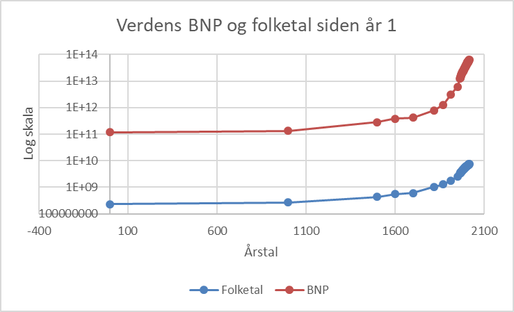 Den dramatiske udvikling de sidste to hundrede år er således tydeligere, når man plotter BNP og folketal (y-aksen er stadig i logaritmer) mod årstal. Det sker i denne figur.