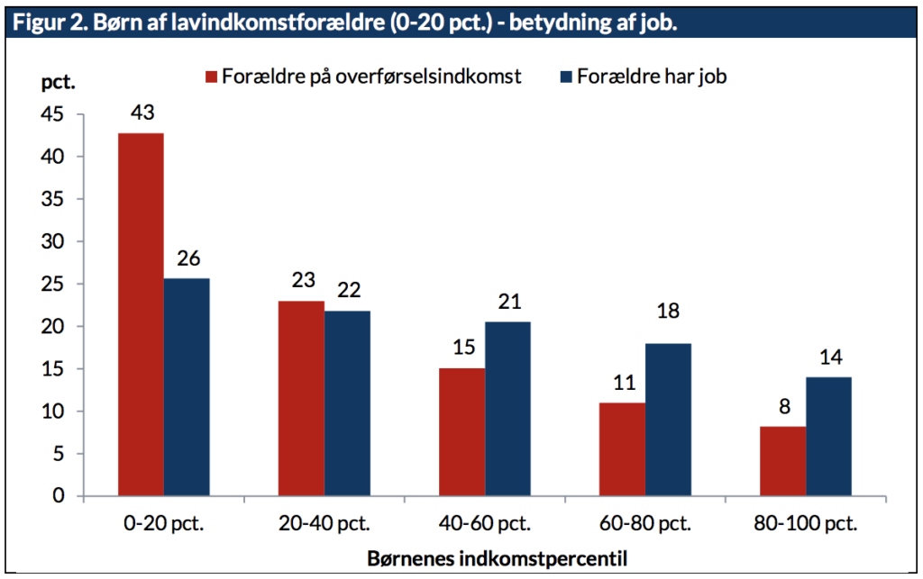 Tilsvarende er det en væsentlig større andel af børn fra lavindkomsthjem med arbejdende forældre som opnår indkomster blandt de 20 pct. rigeste som voksen. Her er tallene 14 pct. hvis forældrene arbejder, og kun 8 pct. hvis forældrenes primære indkomstkilde er overførsler fra det offentlige.
