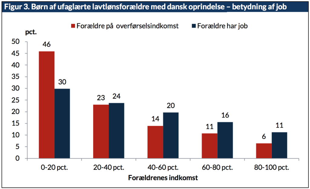 46 pct. af børn som er vokset op med ufaglærte danske lavtlønsforældre med offentlige overførsler som primær indkomstkilde, ender selv op i lavindkomstgruppen som voksne, mens det tilsvarende tal er 30 pct. hvis forældrene har job. Overrepræsentationen i lavindkomstgruppen bliver altså reduceret med godt 61 pct. (fra 26 pct. til 10 pct.), når forældrene har job.