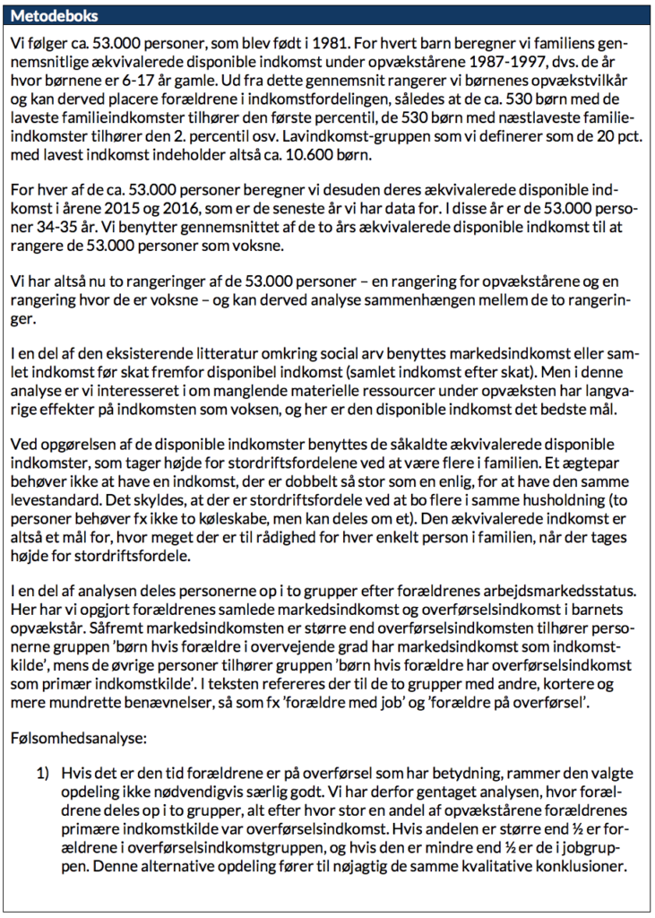 43 pct. af børn fra lavindkomsthjem (blandt de 20 pct. med lavest indkomst), hvor forældrene hovedsageligt får deres indkomst fra overførsler, ender selv i lavindkomstgruppen som voksne. Det tilsvarende tal for børn af lavindkomstforældre, som hovedsageligt får deres indkomst fra job, er 26 pct. Overrepræsentationen i lavindkomstgruppen reduceres med andre ord fra 23 pct. point (43 pct. – 20 pct.) til 6 pct. (26 pct. – 20 pct.). Når forældrene har lavindkomstjob, reduceres børnenes overrepræsentation i lavindkomstgruppen altså til under en tredjedel af niveauet blandt børn af overførselsmodtagere.