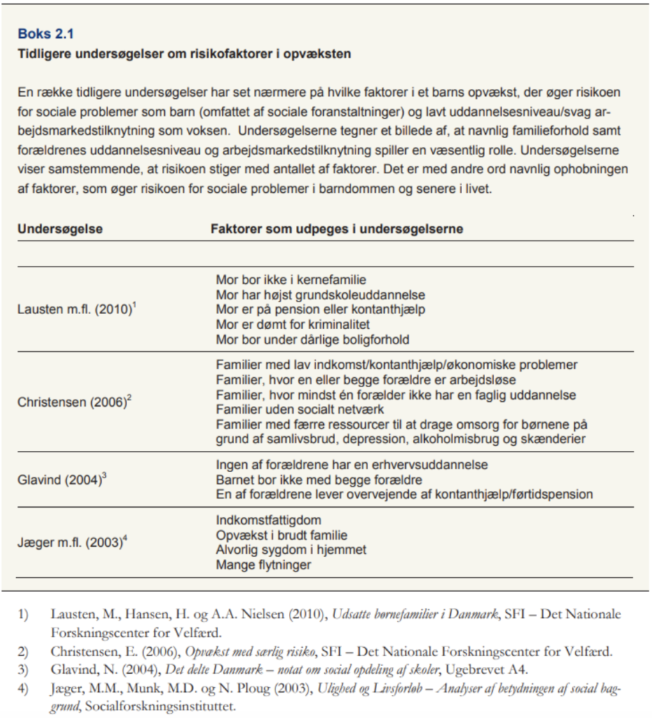 46 pct. af børn som er vokset op med ufaglærte danske lavtlønsforældre med offentlige overførsler som primær indkomstkilde, ender selv op i lavindkomstgruppen som voksne, mens det tilsvarende tal er 30 pct. hvis forældrene har job. Overrepræsentationen i lavindkomstgruppen bliver altså reduceret med godt 61 pct. (fra 26 pct. til 10 pct.), når forældrene har job.