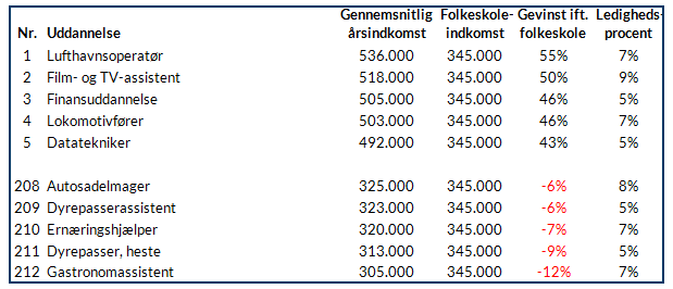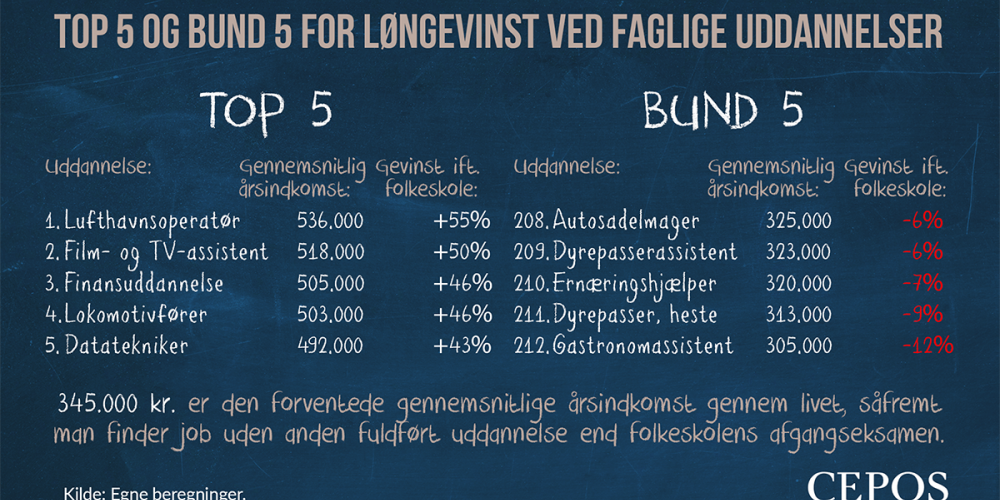 ”I gennemsnit giver de faglærte uddannelser anledning til en forventet årsindkomst på 388.000 kr. Hvis man ikke fuldfører andre uddannelser end folkeskolen, kan man forvente at tjene 345.000 kr. årligt. Helt i top ligger lufthavnsoperatør med en forventet gennemsnitlig indkomst før skat på 536.000 kr., svarende til en gevinst på 56 pct. i forhold til en folkeskoleuddannelse. Derefter kommer uddannelsen til film- og tv-assistent og finansuddannelsen med en forventet gennemsnitsindkomst på hhv. 518.000 kr. og 505.000 kr. Andre uddannelser i top 20 er bl.a. nogle chaufføruddannelser, herunder tankbilchauffør, ambulancechauffør og lokomotivfører”, siger cheføkonom Mads Lundby Hansen, CEPOS.