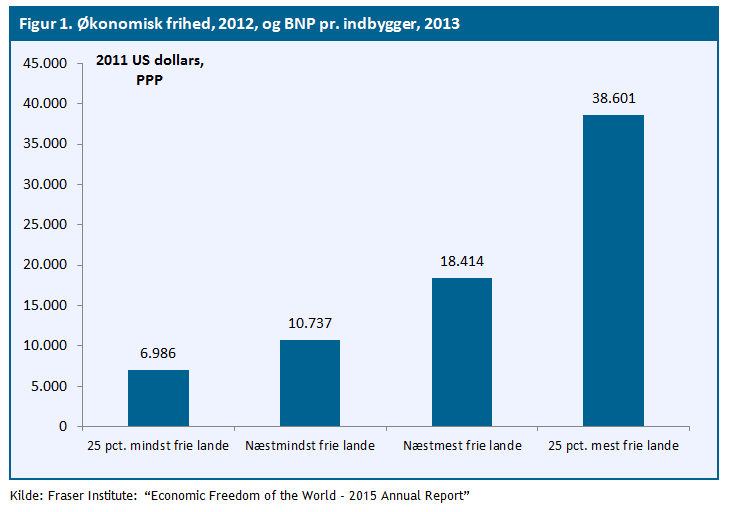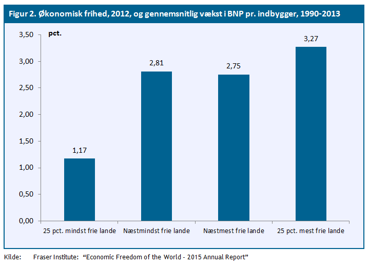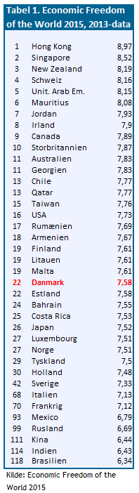 I Economic Freedom of the World 2015 fra Fraser Institute opnår Danmark en karakter på 7,58 (scoren går fra til 0 til 10). Det giver Danmark en placering som nummer 22 af de 157 lande i indekset, jf. tabel 1. I et mere regionalt perspektiv ligger Danmark nummer to i Norden (efter Finland) og nummer otte i Europa (efter Schweiz, Irland, Storbritannien, Rumænien, Finland, Litauen og Malta). I 2015-udgaven af Economic Freedom of the World indgår der 42 variable inden for fem områder.
