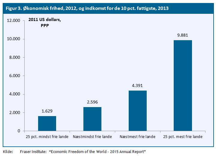 Fraser Institute finder, at indkomsten blandt de 10 pct. fattigste er markant højere i lande med meget økonomisk frihed sammenlignet med lande med lidt økonomisk frihed. Indkomsten er på knap 10.000 dollars blandt de 10 pct. fattigste i de 25 pct. mest frie lande. I de 25 pct. mindst frie lande er gennemsnitsindkomsten blot på 1.600 dollars for de 10 pct. fattigste.
