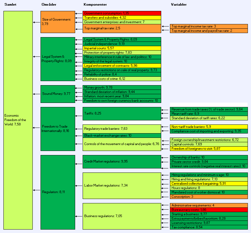 Figur 6. Danmarks score på hhv. Economic Freedom, områder, komponenter og variabler