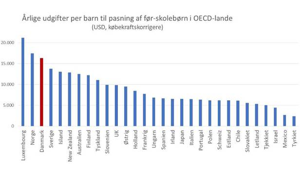 Nogle vil måske opfatte det som en provokation at påstå, at vi bruger mange ressourcer på børnepasning, men ser man på det i international sammenligning, så bruger vi faktisk rigtig mange penge. Figuren her viser tal fra OECD, der sammenligner, hvor mange offentlige skattekroner forskellige lande bruger på pasning per barn i førskolealderen, som rent faktisk bliver passet. De høje danske tal forklares altså ikke af, at vi har mange børn, som bliver passet: det er udgifter per barn. Og der er korrigeret for købekraft, altså for at Danmark er et dyrt land.