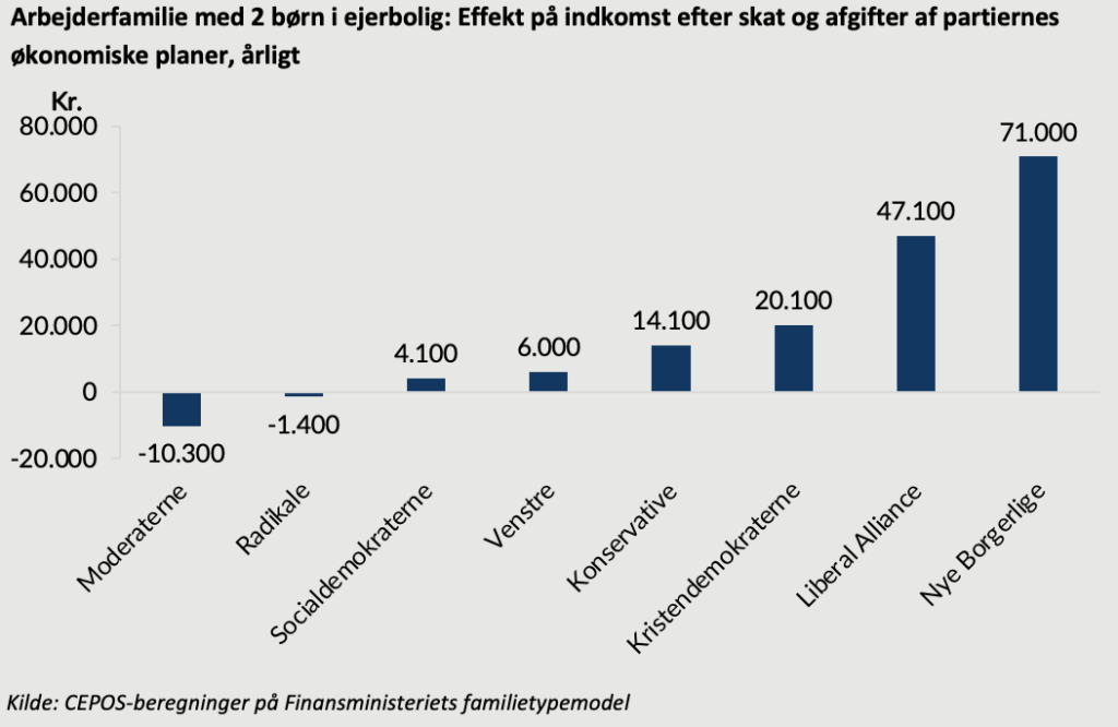 Ny CEPOS-analyse viser, hvordan partiernes politik varigt påvirker familiers indkomst. Der regnes på arbejder-, funktionær- og direktørfamilier. Beregningerne er udført på Finansministeriets familietypemodel.