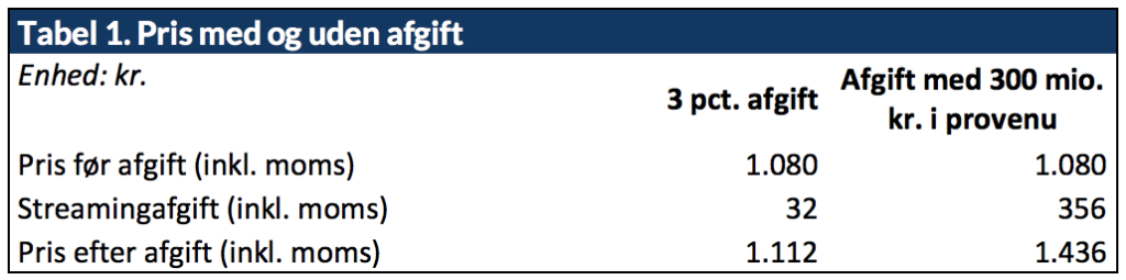 Det overvejes politisk at indføre en skat på streamingtjenester. Notatet beregner konsekvenserne af to varianter af en skat: På henholdsvis 3 pct. (32 kr.) og 33 pct. (356 kr.) om året.