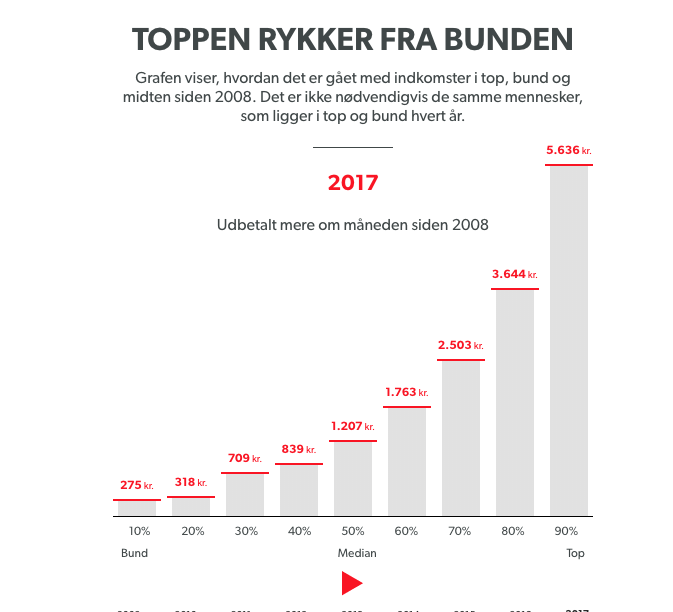 Danmarks Radio kører i dag en historie med overskriften: ”På ti år er toppen stukket af med over 5.000 kroner om måneden”. Altså en historie, der giver indtryk af, at de rige bliver rigere, mens de fattige ikke får noget ud af det.