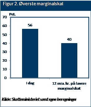 Den øverste marginalskat er i dag på 56 pct. Som nævnt kan marginalskatten sænkes til 40 pct. ved at anvende 12 mia. kr. af råderummet målrettet på lavere marginalskat, jf. figur 2.