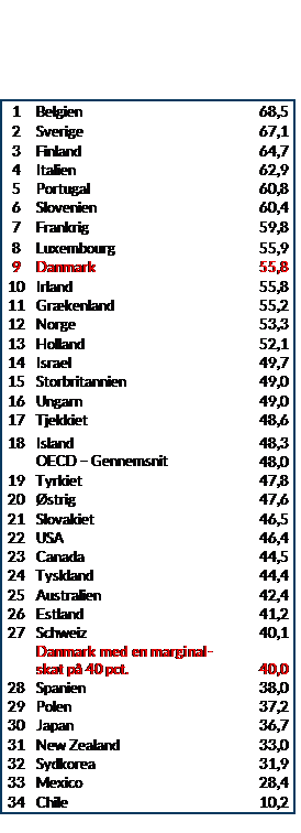 Nedsættes marginalskatten til 40 pct., betyder det, at Danmark går fra at have den 9. højeste højeste marginalskat blandt 34 OECD-lande til at have den 8. laveste marginalskatFor topskatteydere udgør den øverste marginalskat 56 pct. i Danmark, når man alene ser på skat på løn- indkomst. Tager man højde for både skatten på løn og afgifterne på forbrug er marginalskatten ca. 67 pct. for topskatteydere. Forbrugsskattetrykket er højt i Danmark i forhold til andre lande. Den sammensatte marginalskat (dvs. inkl. afgifter) er relevant, fordi arbejdsudbuddet afhænger af, hvor mange varer og tje- nester, der kan købes for en ekstra arbejdstime. . En øverste marginalskat på 40 pct. er på niveau med Schweiz og lavere end i UK, USA og Tyskland, jf. tabel 1.