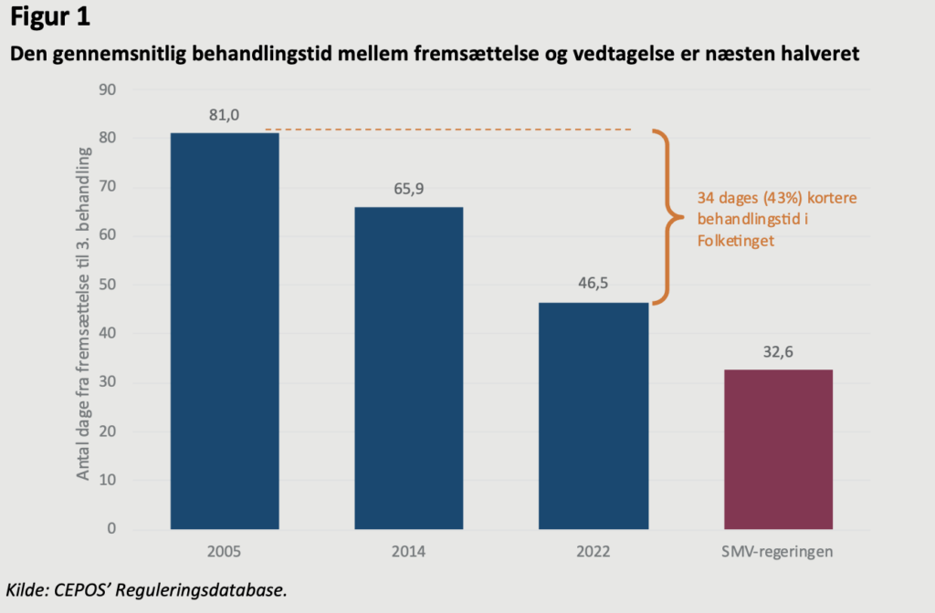 De seneste 18 år er den tid, Folketinget i gennemsnit afsætter til at behandle et lovforslag, næsten halveret. Fra 81,7 dage i 2005 til 46,4 dage i 2022. Samlet set har Folketinget fået 35 dage mindre til at sætte sig ind i de ofte komplekse lovforslag.