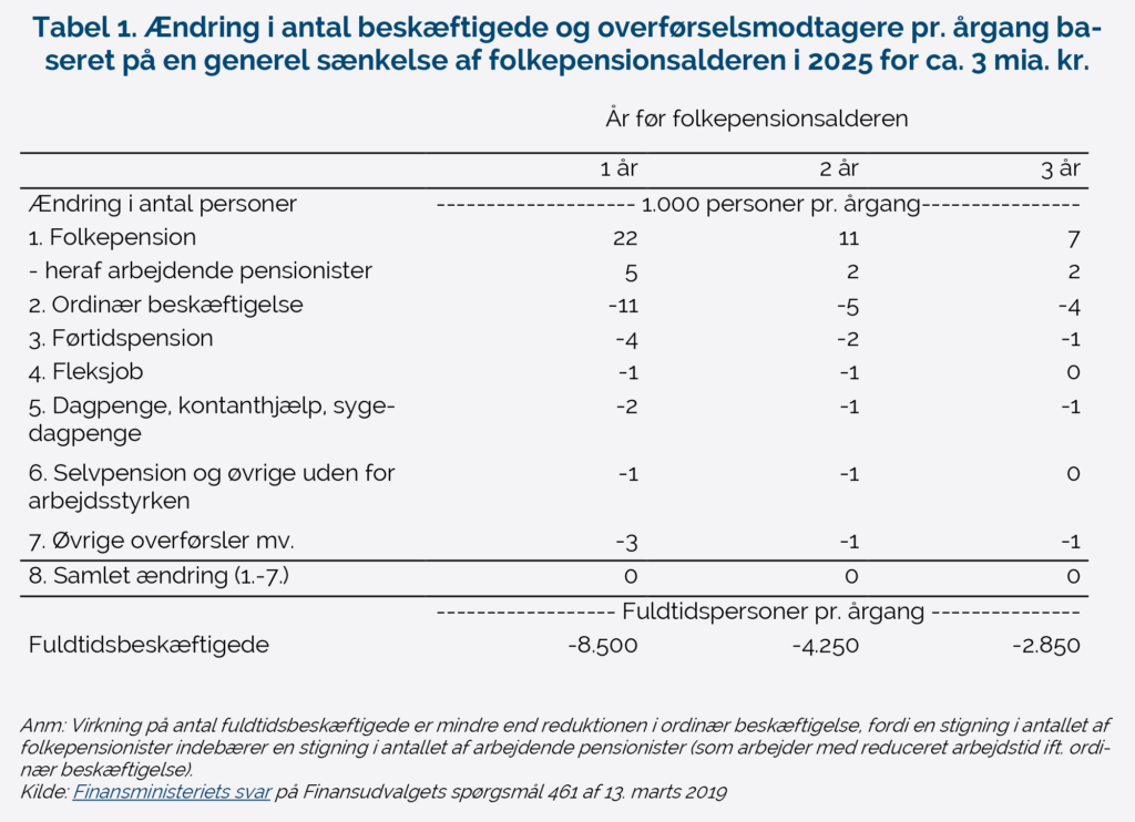 Socialdemokratiet og Mette Frederiksen har tidligere nævnt, at 7.000 personer kan trække sig tilbage 3 år tidligere for de 3 mia. kr. Af de 7.000 personer som Socialdemokratiet nævner, kommer de 3.000 personer fra førtidspension, dagpenge, sygedagpenge, kontanthjælp mv. Dvs. personer der kommer fra en overførselsindkomst til en ny overførselsindkomst (folkepension). Af de 7.000 personer, der kan trække sig 3 år tidligere tilbage, er kun 4.000 personer i ordinær beskæftigelse (svarende til 2.850 fuldtidsbeskæftigede), jf. tabel 1 som gengiver Finansministeriets beregning.