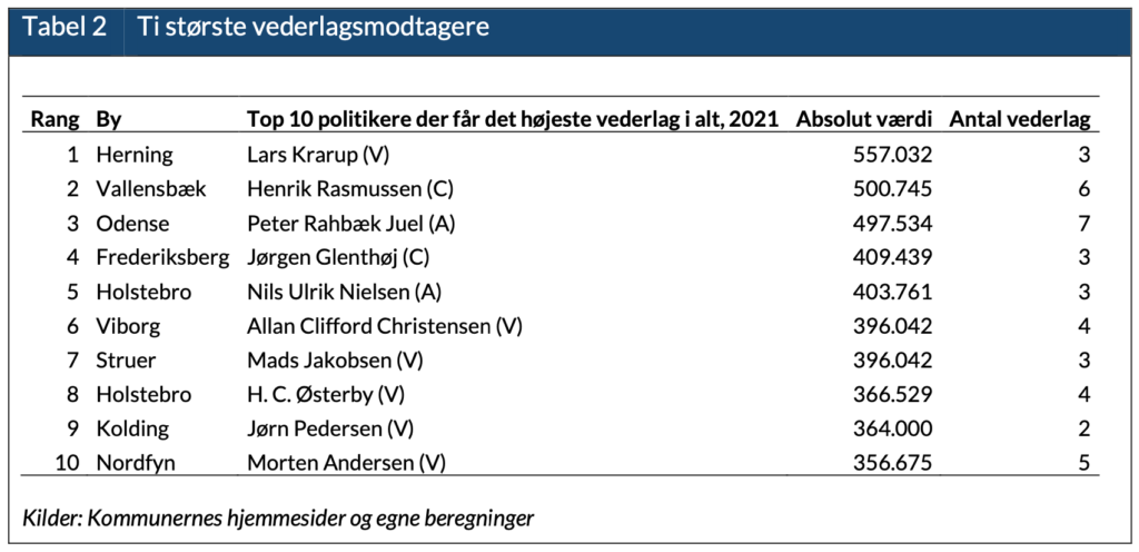 Den største modtager i 2021 får 557.032 kr. i særskilte vederlag for kommunale ”ben”.