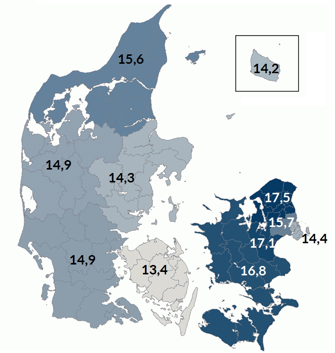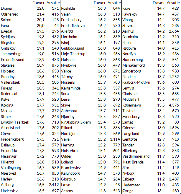 På tværs af landsdele er variationen i sygefraværet stor. En sammenligning viser, at Nordsjælland har landets højeste sygefravær på gennemsnitligt 17,5 dagsværk pr. ansat, mens Fyn har landets laveste sygefravær på gennemsnitligt 13,4 dagsværk pr. ansat, jf. figur 2.
