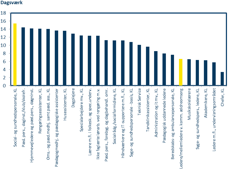 Sammenlignet med andre overenskomstgrupper på det kommunale og regionale område, ligger sygefraværet[1] blandt det kommunalansatte plejepersonale højt, jf. figur 1. SOSU-assistenterne, SOSU-hjælperne og de ufaglærte har i gennemsnit et sygefravær på 15,4 dagsværk pr. ansat, mens deres lederes sygefravær ligger på 6,6 dagsværk pr. ansat.