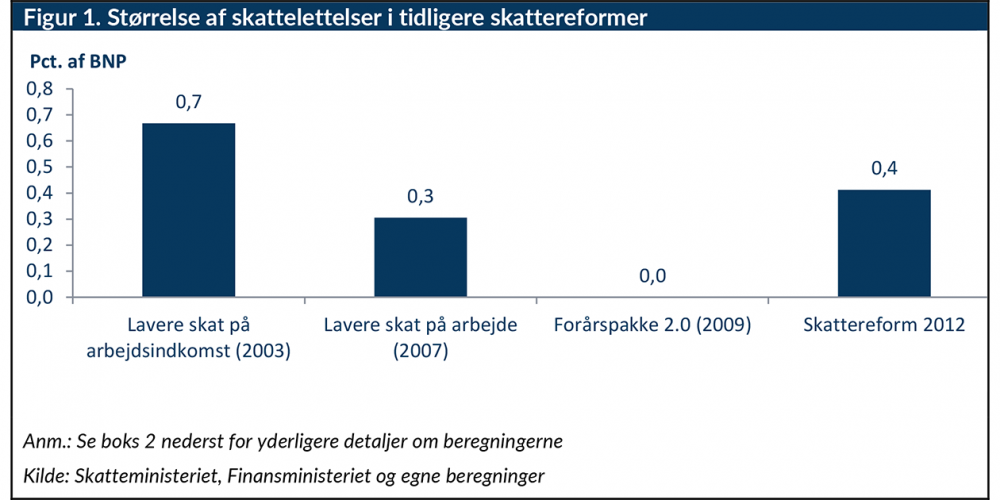 CEPOS-analyse, der omhandler ”størrelsen” på 4 tidligere skattereformer (2003, 2007, 2009 og 2012). Størrelsen måles i samlet provenulettelse (skattelettelse fratrukket eventuelle skatteforhøjelser) hhv. effekt på beskæftigelsen.