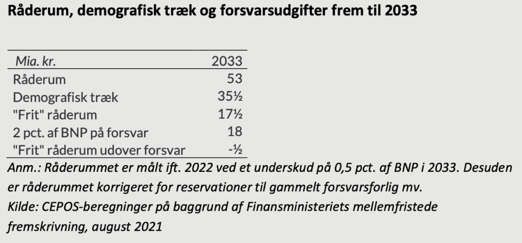 I 2033 er der umiddelbart et råderum på 53 mia. kr. ved underskud på 0,5 pct. af BNP, jf. tabel 1. Et politisk flertal ønsker at lade udgifterne til offentligt forbrug vokse med det demografiske træk. Lægges en sådan udgiftsvækst til grund, vil råderummet frem mod 2033 reduceres med 351⁄2 mia. kr., hvorefter der resterer 171⁄2 mia. kr. i såkaldt ”frit råderum”. Det er ikke helt nok til at dække de øgede forsvarsudgifter på 18 mia. kr. Derudover må det antages, at der skal være råderum til politiske ønsker til ekstra udgifter i 11 finanslove frem til 2033.