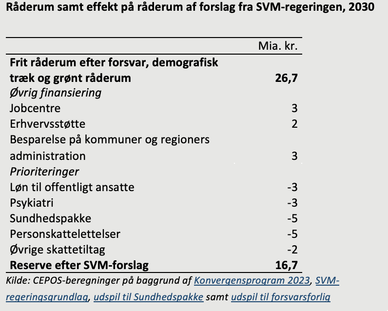 Finansministeriet har opjusteret råderummet markant med 16 mia. kr. frem til 2030. Det samlede råderum frem til 2030 er nu på 64 mia. kr. Efter reservationer til demografisk træk, forsvar og grønt råderum er der fortsat et betydeligt frit råderum på knap 27 mia. kr. Dette notat ser på, hvorvidt dette råderum er stort nok til at dække SVM-regeringens ønsker:
