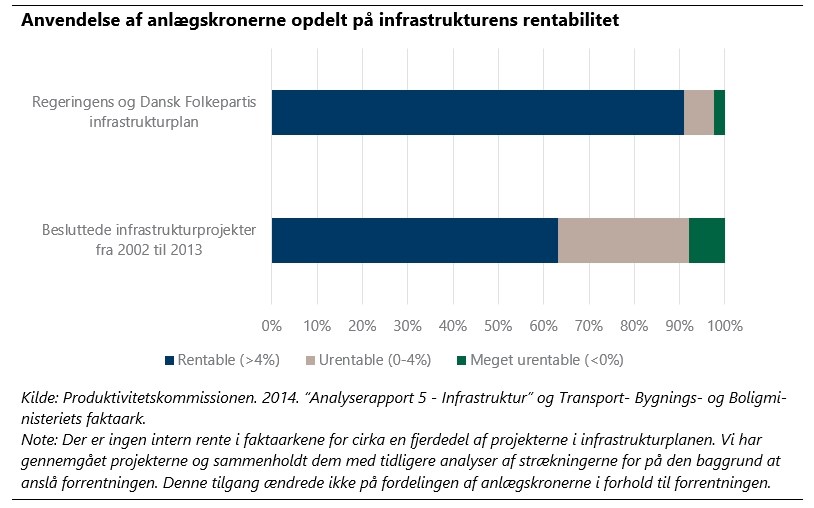 Produktivitetskommissionen gennemgik alle besluttede infrastrukturprojekter fra 2002 til 2013. De kom frem til, at hele 37 procent af anlægsbudgettet var blevet brugt på urentable projekter — det vil sige projekter, hvor samfundets gevinster i form af blandt andet sparet rejsetid ikke stod mål med samfundets omkostninger til blandt andet anlæg og drift.