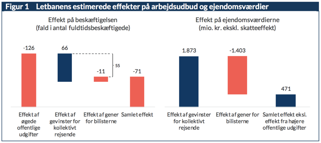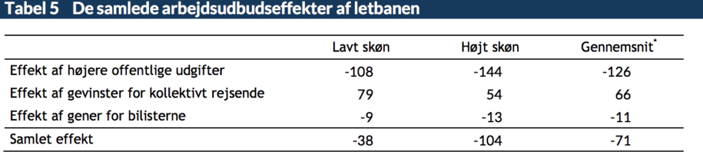 Vores gennemgang af beregningerne viser, at effekten på arbejdsudbuddet er negativ, når man medregner de øgede offentlige udgifter, som letbanen medfører. Samlet set reducerer letbanen arbejdsudbuddet med mindst 71 fuldtidsbeskæftigede. Selv hvis man ser bort fra effekten af øgede offentlige udgifter, er effekten af letbanen kun omkring 55 fuldtidsbeskæftigede.