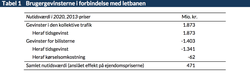 I stedet har vi beregnet de samlede gevinster for de kollektivt rejsende på baggrund af effekterne for bilisterne (hvor alle de nødvendige data fremgår af rapporten) og forholdet mellem brugergevinsterne, jf. tabel 1.