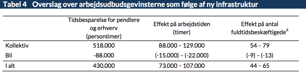 Hvis 17-25 pct. af rejsetidsgevinsterne bliver anvendt på at arbejde, er den samlede effekt på arbejdsudbuddet ca. 44-65 fuldtidsbeskæftigede jf. tabel 4. Heri indgår som nævnt ikke de afledte effekter som følge af dyrere erhvervstransport, som vil påvirke arbejdsudbuddet negativt.