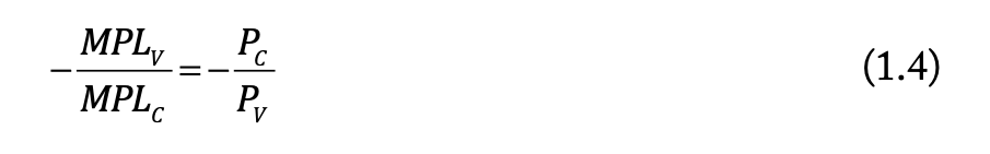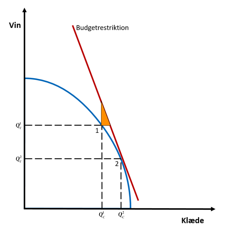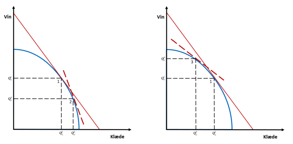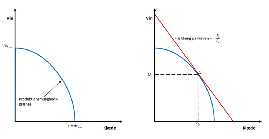 Udtrykket på højresiden af ligning (1.4) er den relative pris på klæde i forhold til vin, og det er hældningen på prislinjen. Hvis den relative pris netop er – Pc / Pv , så produceres der netop kombinationen ( Qc , Qv ) i punktet 1 i figur 1b, hvor hældningen på produktionsmulighedsgrænsen er lig med hældningen på prislinjen, der er de relative priser, figur 1b.