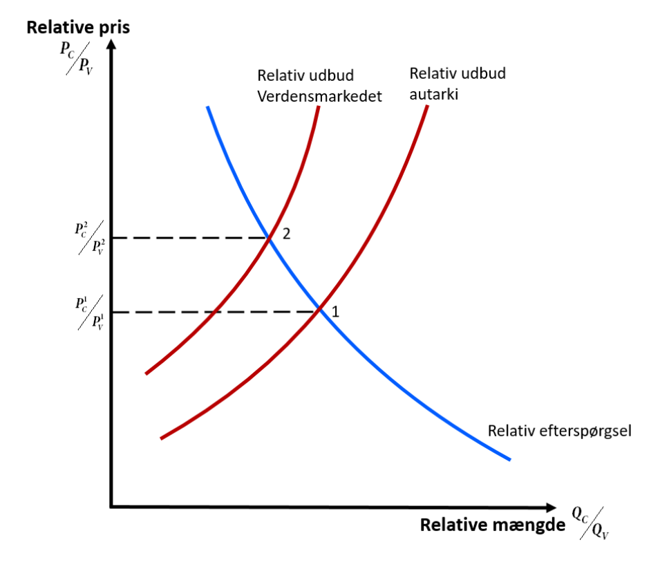 Åbnes op for frihandel, ændres det relative udbud af klæde i forhold til vin. I figur 3 er det vist, at der på verdensmarkedet produceres relativ mere vin end klæde end i hjemlandet. Den relative udbudskurve er derfor forskudt op og til venstre i forhold til hjemlandets udbudskurve under autarki. Den relative pris på klæde i forhold til vin er derfor højere på verdensmarkedet end i hjemlandet under autarki, punkt 2 i figur 3.