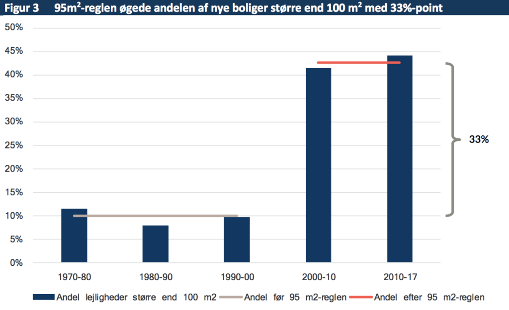 Effekten af 95 m2-reglen ses også i andelen af nybyggede boliger, der er større end 100 m2. Da man indførte af 95 m2-reglen steg andelen af nye boliger, der var større end 100 m2 med 33%-point, fra 10% før man indførte reglen, til 43% efterfølgende. Næsten hver anden af de parcelhuse, rækkehuse og etageboliger, der er blevet bygget i Københavns Kommune efter man indførte 95 m2-reglen, har altså været boliger, som er større end 100 m2. Før man indførte reglen, var det blot hver 10. nye bolig, der var større end 100 m2.
