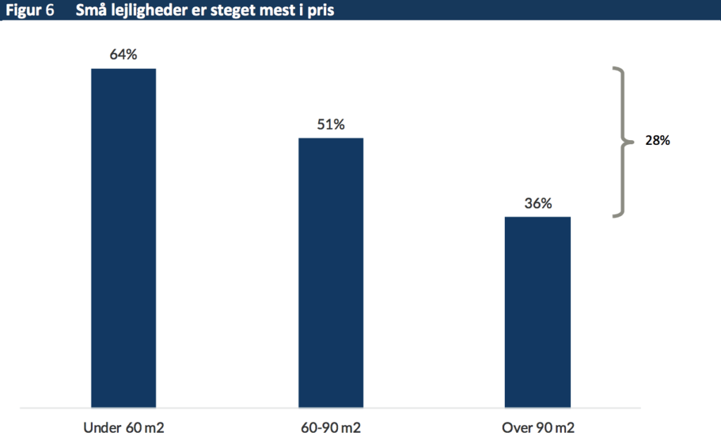 Boligøkonomisk Videnscenter havde i Bolig&Tal 13 fokus på prisudviklingen for små og store ejerlejligheder i Københavns Kommune (se Boligøkonomisk Videncenter (2017)).Etageboliger udgør i Københavns Kommune mere end 90 % af boligerne. Bemærk dog, at det kun for ejerlejligheder er muligt at vise prisudviklingen. De påpeger, at små lejligheder er steget 28% mere i pris end store lejligheder siden 2013, jf. figur 6. Denne udvikling tyder ifølge Boligøkonomisk Videnscenter på, at efterspørgslen på små lejligheder er steget, uden at den — pga. 95 m2-reglen — kan imødekommes af markedet. Boligøkonomisk Videnscenter skriver således, at prisudviklingen i København siden 2013 ”understreger manglen på små ejerlejligheder”.