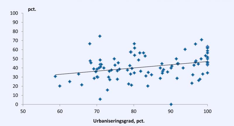 Tabellen viser for det første, at en stigning i urbaniseringsgraden på 1 pct. øger beskæftigelsesgraden med 0,5 pct. Sammenhængen er statistisk signifikant på et højt niveau.