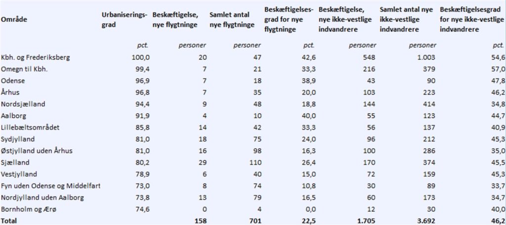 Beskæftigelsesfrekvensen for ikke-vestlige indvandrere fra 2009-10 var efter tre år i landet, dvs. i 2012, 55 pct. i København og Frederiksberg mod 46 pct. for landet i landsgennemsnit. På Fyn, bortset fra Odense og Middelfart, var den 34 pct.