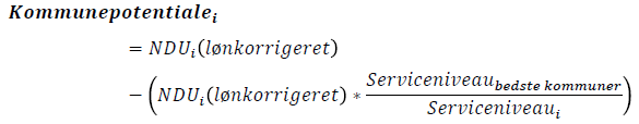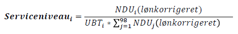 Nævneren viser således kommune i’s beregnede behov, som andel af de samlede nettodriftsudgifter i hele landet. Hensigten er at stille kommunerne lige i deres muligheder for at yde service efter behov.