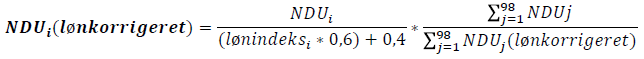 NDUi (lønkorrigeret) er kommune i’s nettodriftsudgifter korrigeret for regionale lønvariationer, da et højt udgiftsniveau til dels kan forklares ved høje regionale lønninger.Nettodriftsudgifterne er opgjort på hovedkonto 0-6, dranst 1+2 og hovedart 1-9, med undtagelse af de funktioner, som er specifikke for Bornholm.