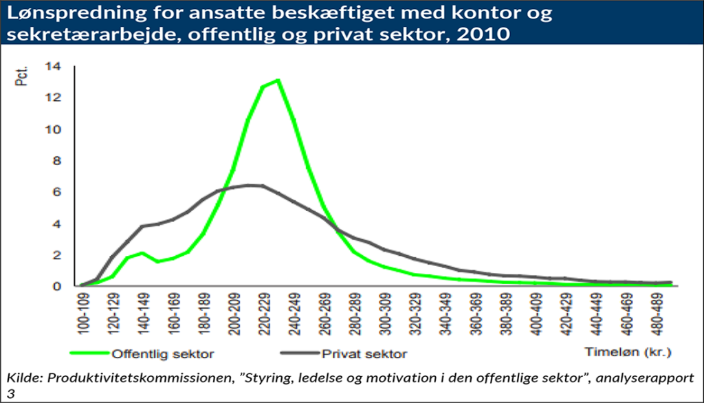 Der er langt mindre lønspredning for offentligt ansatte sammenlignet med ansatte i den private sektor for sammenligneligt arbejde, jf. figuren. Det understreger, at der i den offentlige sektor i meget ringere grad end i den private sektor aflønnes efter præstationer eller forskelle i produktivitet.