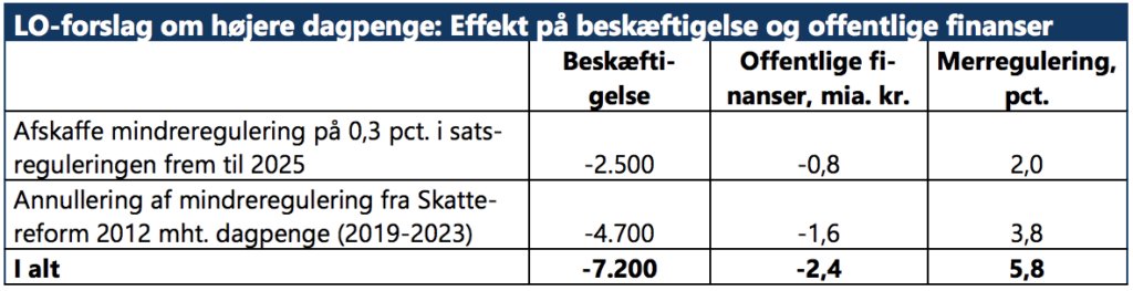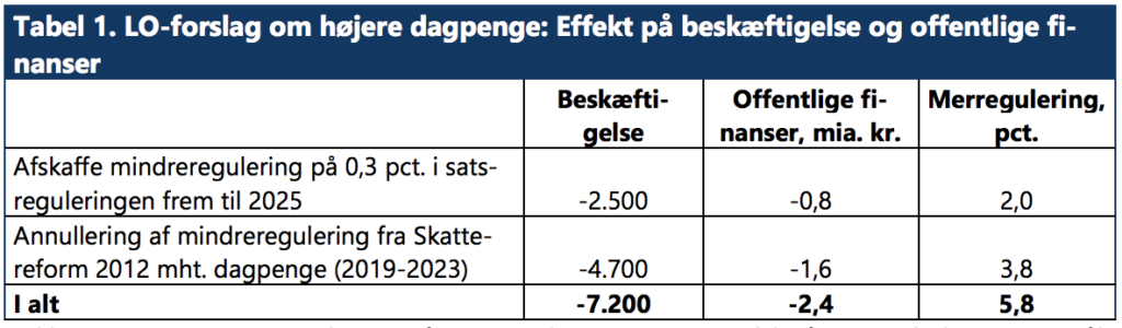 På baggrund af Dagpengekommissionens regnemetode vurderes det, at LO’s forslag om 6 pct. højere dagpenge vil reducere beskæftigelsen med ca. 7.000 personer. Det skyldes, at de højere dagpenge vil gøre det mindre attraktivt at tage et job i forhold til det nuværende regelsæt. Den lavere beskæftigelse vil medvirke til, at den samlede forringelse af de offentlige finanser vil udgøre 2½ mia. kr., jf. tabel 1.