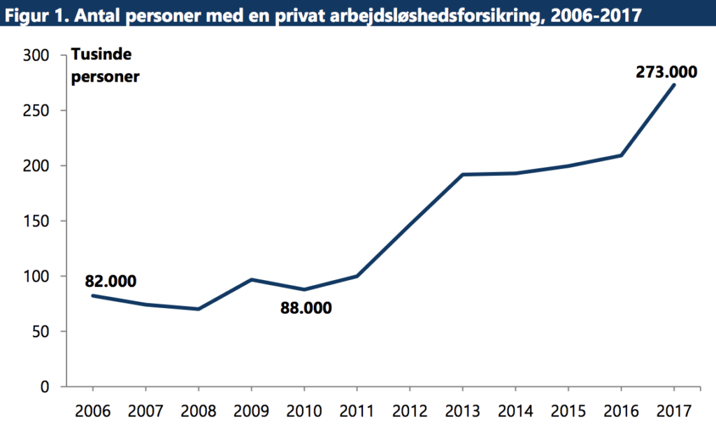 I de senere år er der sket en stigning i antallet af personer med en privat arbejdsløshedsforsikring. I 2010 havde 88.000 en privat arbejdsløshedsforsikring. I 2017 var det vokset til 273.000 personer, dvs. en 3-dobling på 7 år.