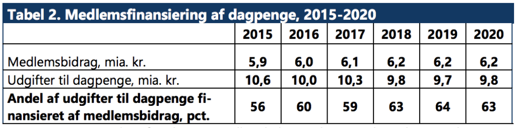 Det nuværende dagpengesystem er kendetegnet ved, at det er ”one-size-fits-all”. Der er ikke mulighed for at vælge fx højere ydelse mod til gengæld at være dækket i en kortere periode. Dagpengesystemet kan dermed siges at udgøre en basisydelse. Det nuværende system er delvist finansieret af skatteyderne, idet dagpengeforsikrede kun finansierer ca. 60 pct. af udgifterne til dagpenge gennem medlemsbidrag, jf. tabel 2 nedenfor.