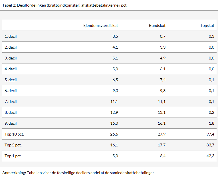 Af tabel 2 fremgår, hvor stor en andel af skatterne, der betales af indkomsterne i indkomstfordelingen. Det er bemærkelsesværdigt, at ejendomsværdiskatten i meget mindre grad end topskatten falder på de høje indkomster. Hvor de ti procent højeste indkomster eksempelvis står for 97,4 pct. af topskatten, tegner de sig kun for 26,6 pct. af ejendomsværdiskatten. Generelt svarer fordelingen af ejendomsværdiskatten i grove træk til fordelingen af bundskatten, bortsat fra at de ti pct. laveste indkomster betaler en større andel af ejendomsværdiskatten.