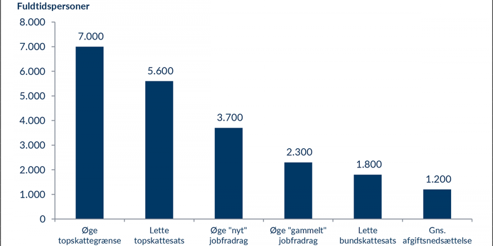 ”VLAK-regeringens udgangspunkt er, at det offentlige forbrug skal vokse med 0,3 pct. årligt. Det lægger beslag på ca. 13 mia. kr. af det samlede råderum på 37 mia. kr. frem til 2025. Ved at anvende det resterende råderum på ca. 23 mia. kr. frem til 2025 på det nye jobfradrag, så kan man få en fremgang i beskæftigelsen på ca. 20.000 personer. Det vil være den største skattereform i nyere danmarkshistorie. Foghs 2009-reform øgede beskæftigelsen med 18.000 personer, mens Thornings skattereform øgede beskæftigelsen med 16.000 personer. Med det nye, moderne jobfradrag vil alle i job få en marginalskattelettelse, og dem med indkomster over 340.000 kr. vil få en lettelse i marginalskatten på ca. 5 pct.point. En LO-familie vil opleve en fremgang i rådighedsbeløbet på 20.000 kr.”, siger cheføkonom Mads Lundby Hansen, CEPOS.