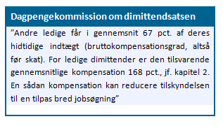 Andre ledige får i gennemsnit 67 pct. af deres hidtidige indtægt (bruttokompensationsgrad, altså før skat). For ledige dimittender er den tilsvarende gennemsnitlige kompensation 168 pct., jf. kapitel 2. En sådan kompensation kan reducere tilskyndelsen til en tilpas bred jobsøgning (Hovedrapport s. 18)