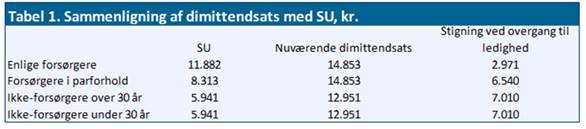 Aftalen om Dagpengereformen betyder, at dimittendsatsen for ikke-forsørgere sættes ned fra 82 pct. til 71,5 pct. af maksimale dagpenge (13.000 kr. pr. måned), mens satsen for forsørgere opretholdes på 82 pct. (14.900 kr. pr. måned). Der er imidlertid stadig tale om en meget betydelig og uhensigtsmæssig indkomstfremgang i forbindelse med arbejdsløshed for studerende, som udelukkende har haft SU som indtægtskilde.