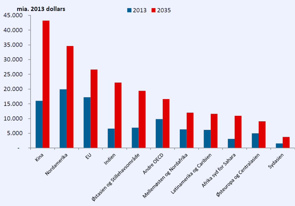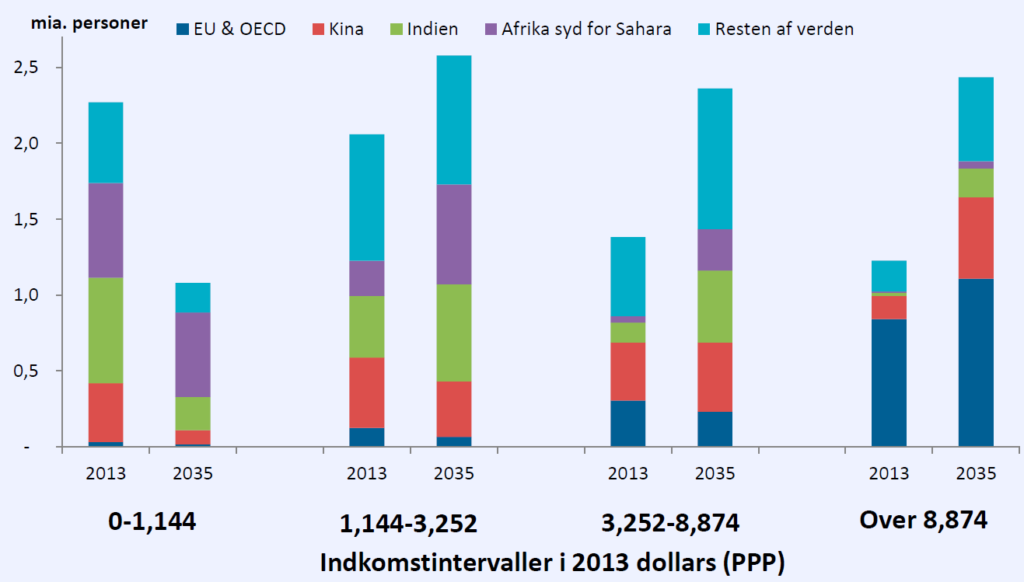 Den høje økonomiske vækst i udviklingslande betyder, at mange mennesker vil bevæge sig op i et højere indkomstlag. Antallet af personer, der tjener mellem 1.144 og 3.252 købekraftskorrigerede dollars om året, forventes at stige med omkring 500 mio. (fra godt 2 mia. personer) mellem 2013 og 2035, mens antallet, der tjener mellem 3.252 og 8.874 dollars om året, forventes at stige med knap 1 mia. personer (fra knap 1,4 mia. personer), jf. figur 2. Væksten i disse to indkomstlag sker især i Indien og Afrika syd for Sahara. Antallet af mennesker, der tjener mere end 8.874 dollars om året, forventes at fordobles fra 1,2 mia. i 2013 til 2,4 mia. i 2035, heraf mange i Kina og de avancerede økonomier.