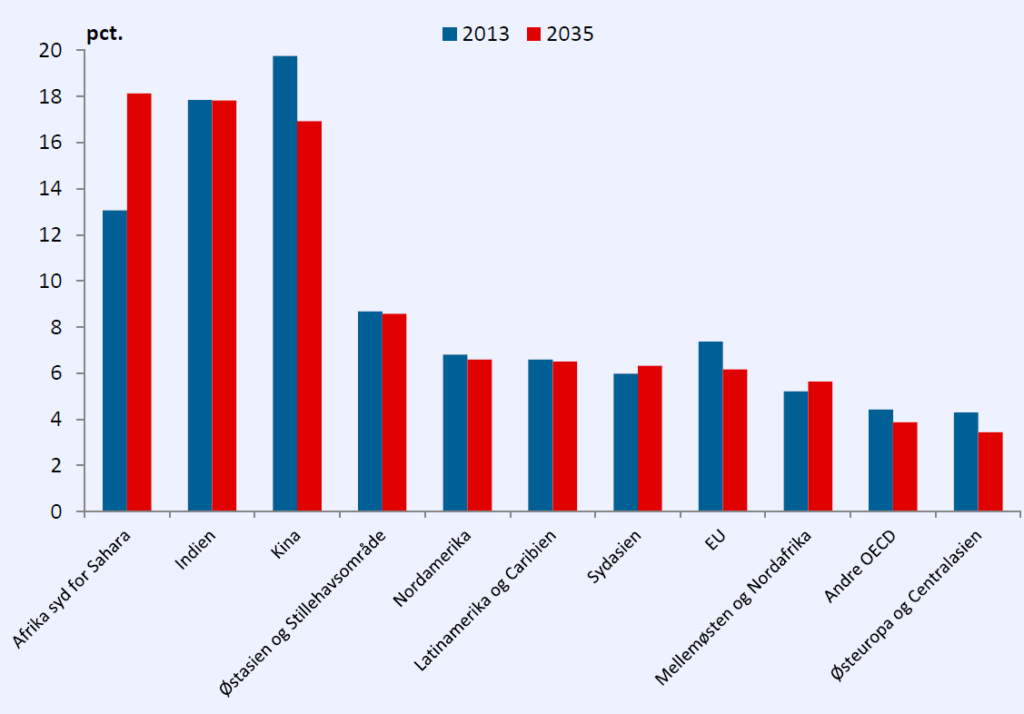 Figur 4. Regional befolknings andel af verdens befolkning, 2013 og 2035