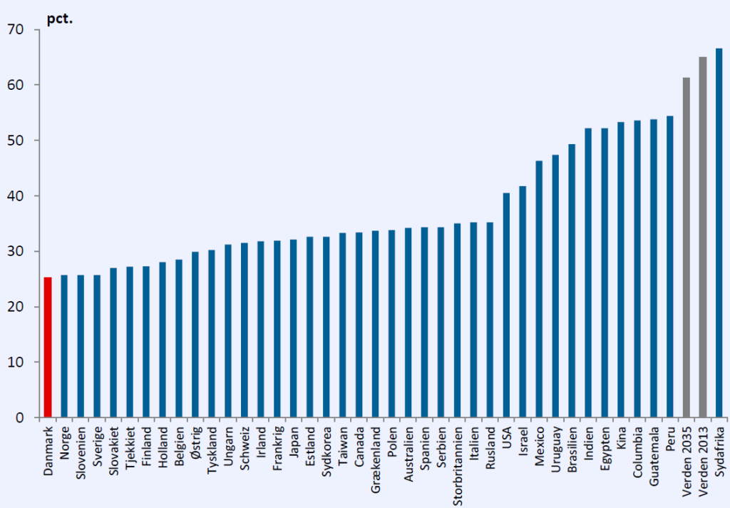 Normalt når udviklingen i økonomisk ulighed bliver diskuteret, er der fokus på uligheden i de enkelte lande. Det er sjældent, at uligheden opgøres for hele klodens befolkning samlet. De to økonomer Tomáš Hellebrandt (Bank of England) og Paolo Mauro (IMF), der er tilknyttet den amerikanske tænketank PetersonInstitute for International Economics, har i en artikel[1] set på udviklingen i uligheden i verden. Dels betragter de den historiske udvikling fra 2003 til 2013 og finder, at Gini-koefficienten er faldet fra 69 pct. i 2003 til 65 pct. i 2013. Dels foretager de en fremskrivning af velstandsudviklingen i verdens lande til 2035 og vurderer på den baggrund, at Gini-koefficienten vil falde yderligere til 61 pct. i 2035, jf. tabel 1.