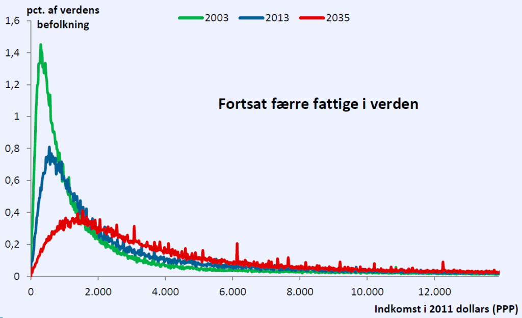 Tilsvarende forventes antallet af mennesker, der lever under Verdensbankens fattigdomsgrænse på 1,25 dollars (i 2005-priser) om dagen, at falde fra omkring 850 mio. i 2013 (svarende til 12,3 pct. af den samlede befolkning) til ca. 300 mio. personer i 2035 (svarende til 3,6 pct. af den forventede befolkning).